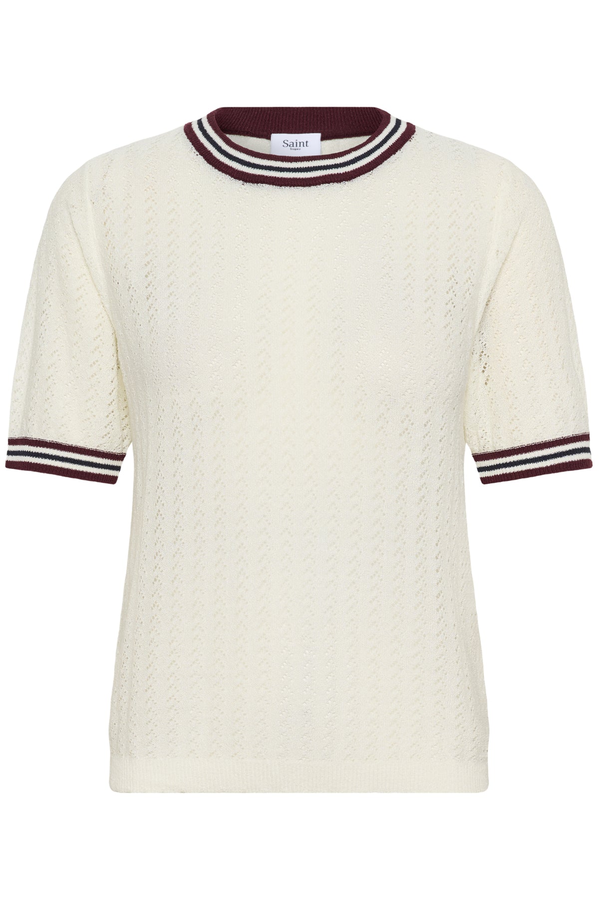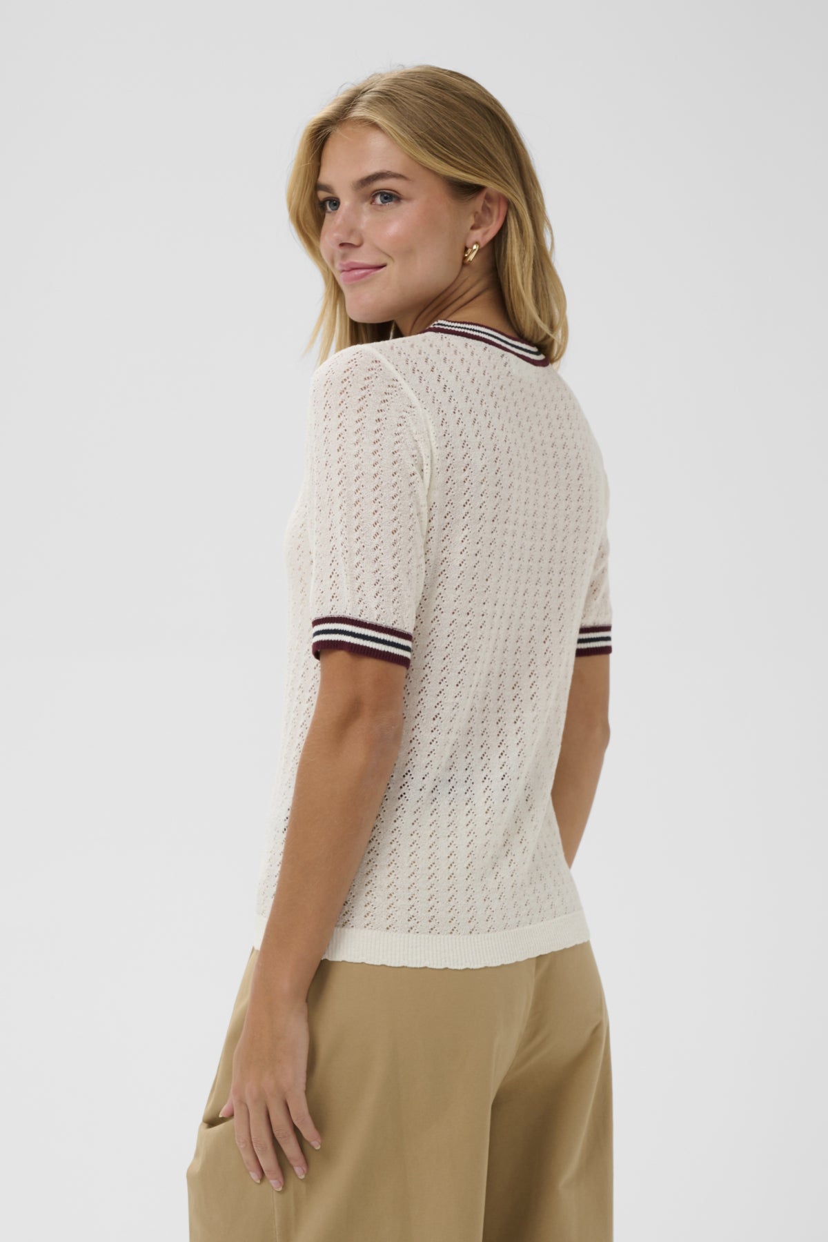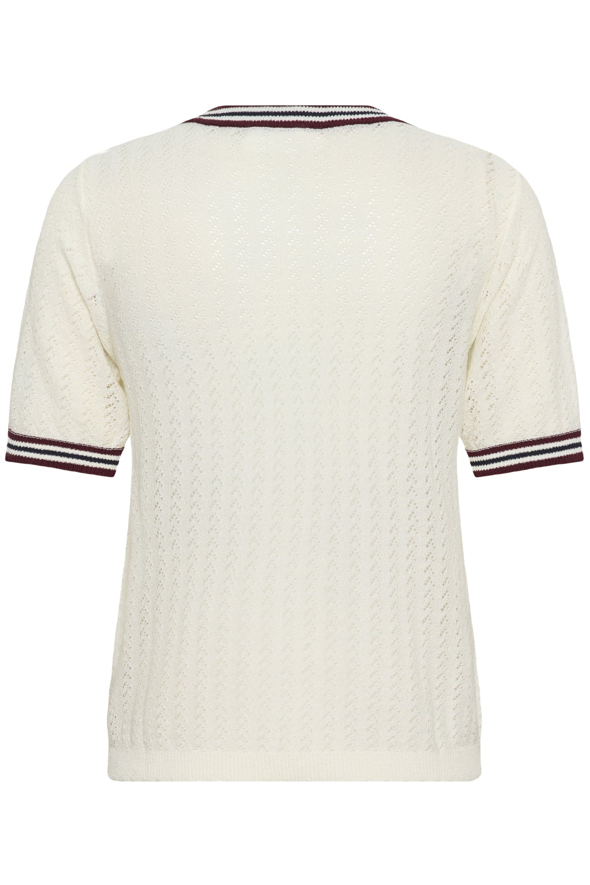 - Details: Gebreide top met opengewerkte structuur en contrasterende strepen aan hals en mouwen.